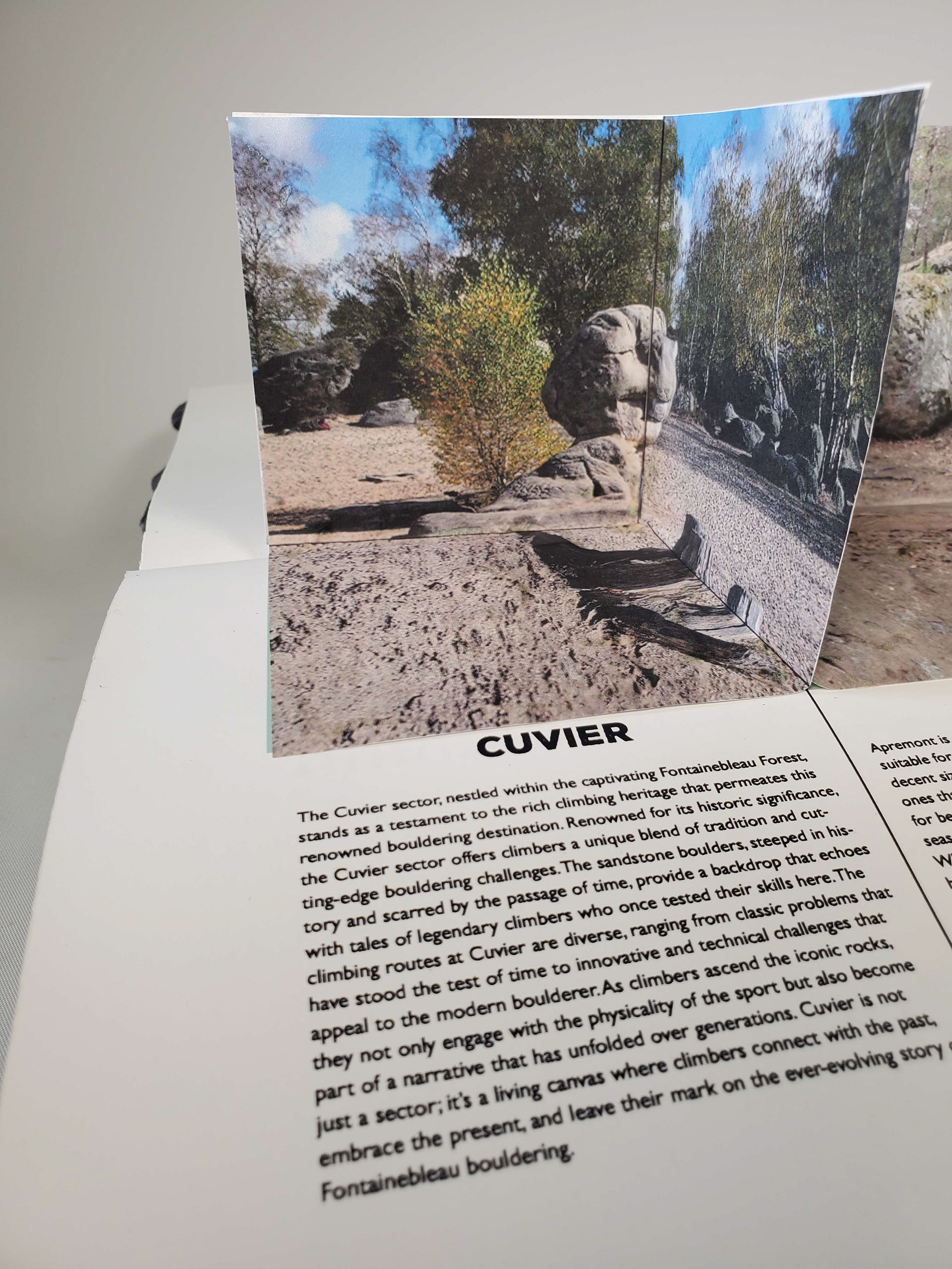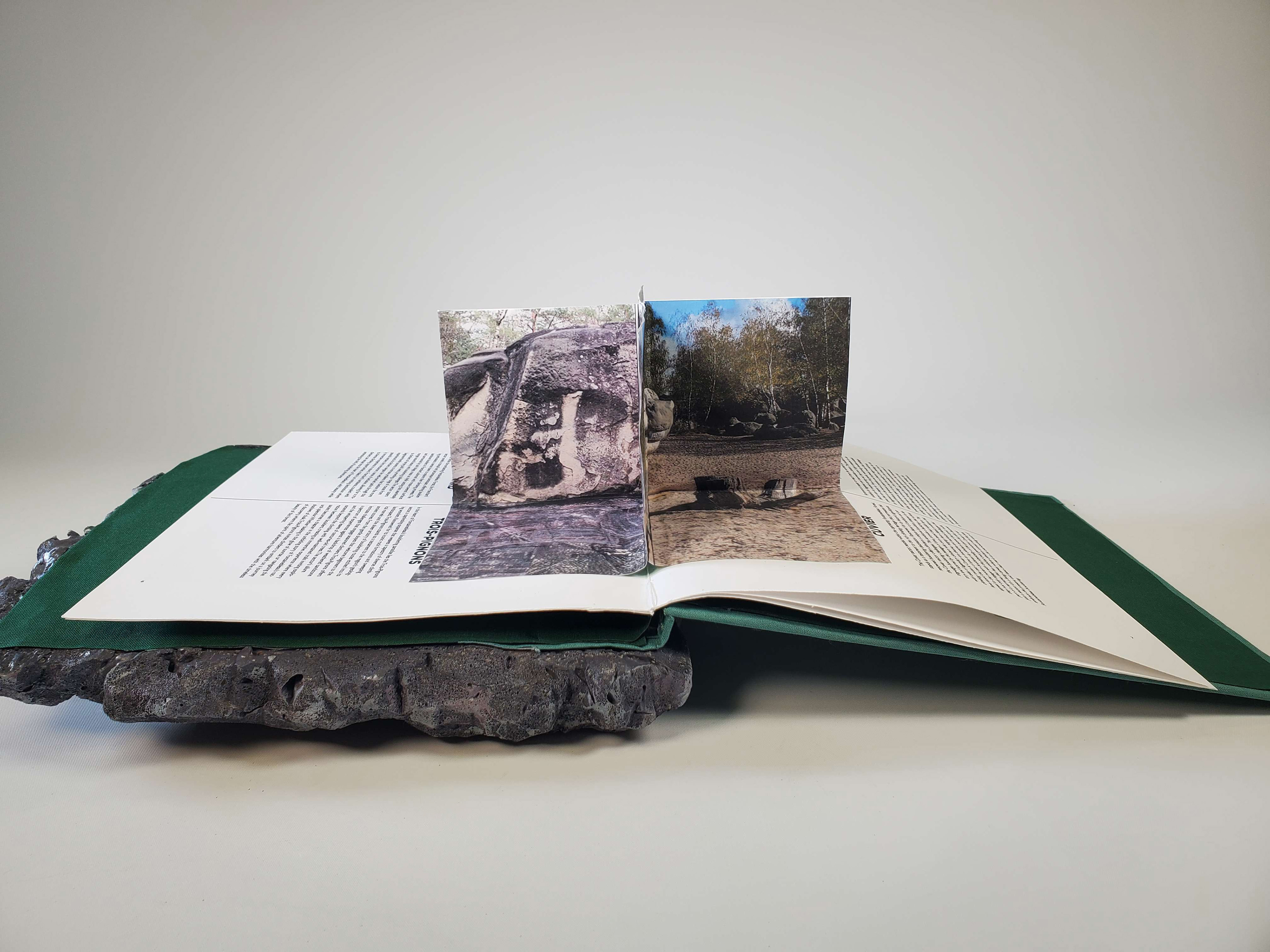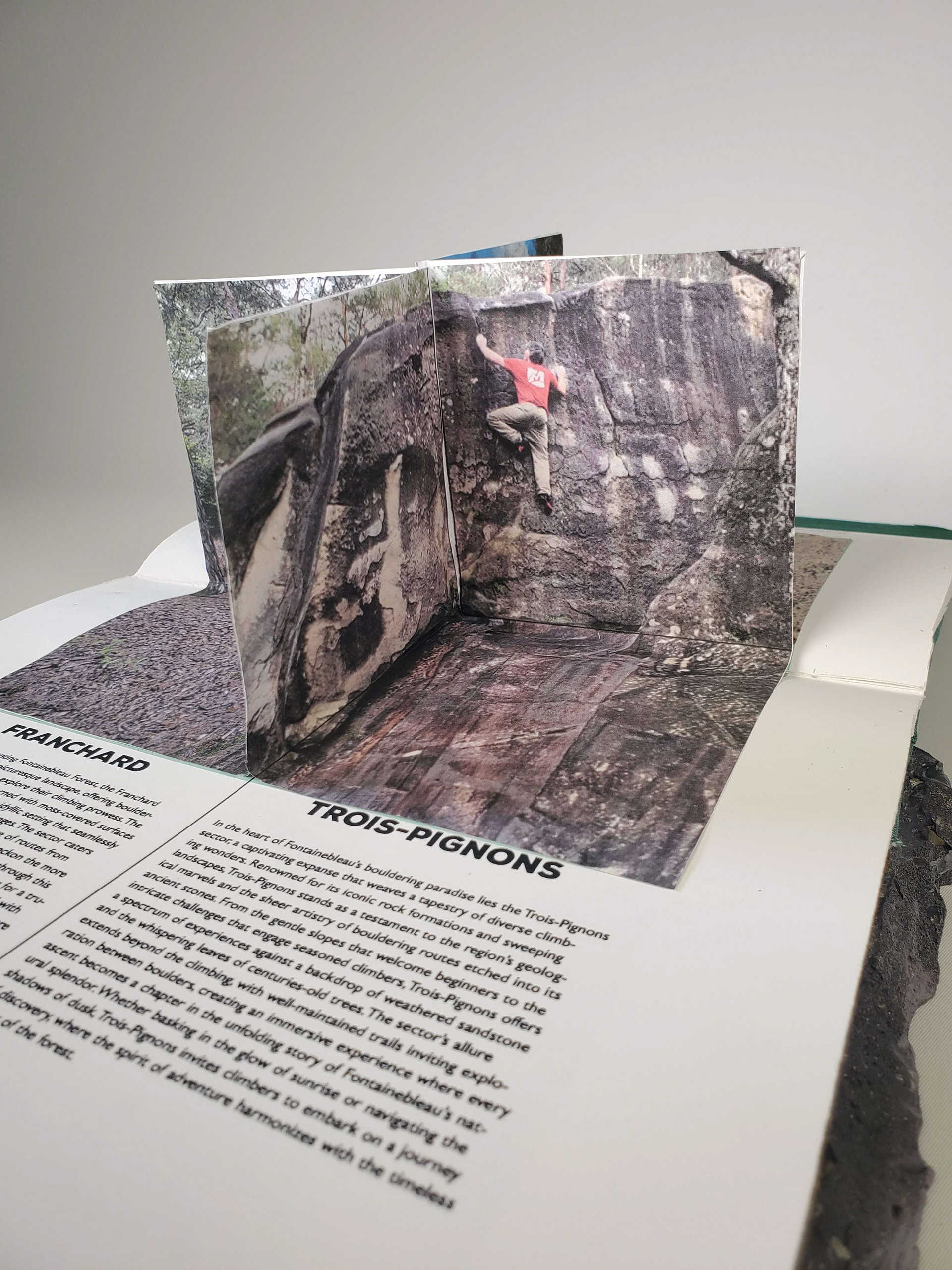 Scaling Heights in Fontainebleau is an informative book that uses interactive elements to engage its audience. Starting off with a realistic, rock-textured cover, it immediately appeals to rock climbing enthusiasts. Fontainebleau is home to one of the largest outdoor rock climbing areas in the world. Through interactive design elements, the book offers easy guidance for newcomers while also delivering in-depth insights for experienced climbers. Readers can flip through the pages to reveal a four-way pop-up showcasing the main sections, each containing detailed information. The end of the book offers a full-area map with markers for each rock face, as well as a customer written log documenting who has climbed there and when, allowing patrons to return and review past entries. This book was skillfully custom-made; cut, glued, and put together all by hand.