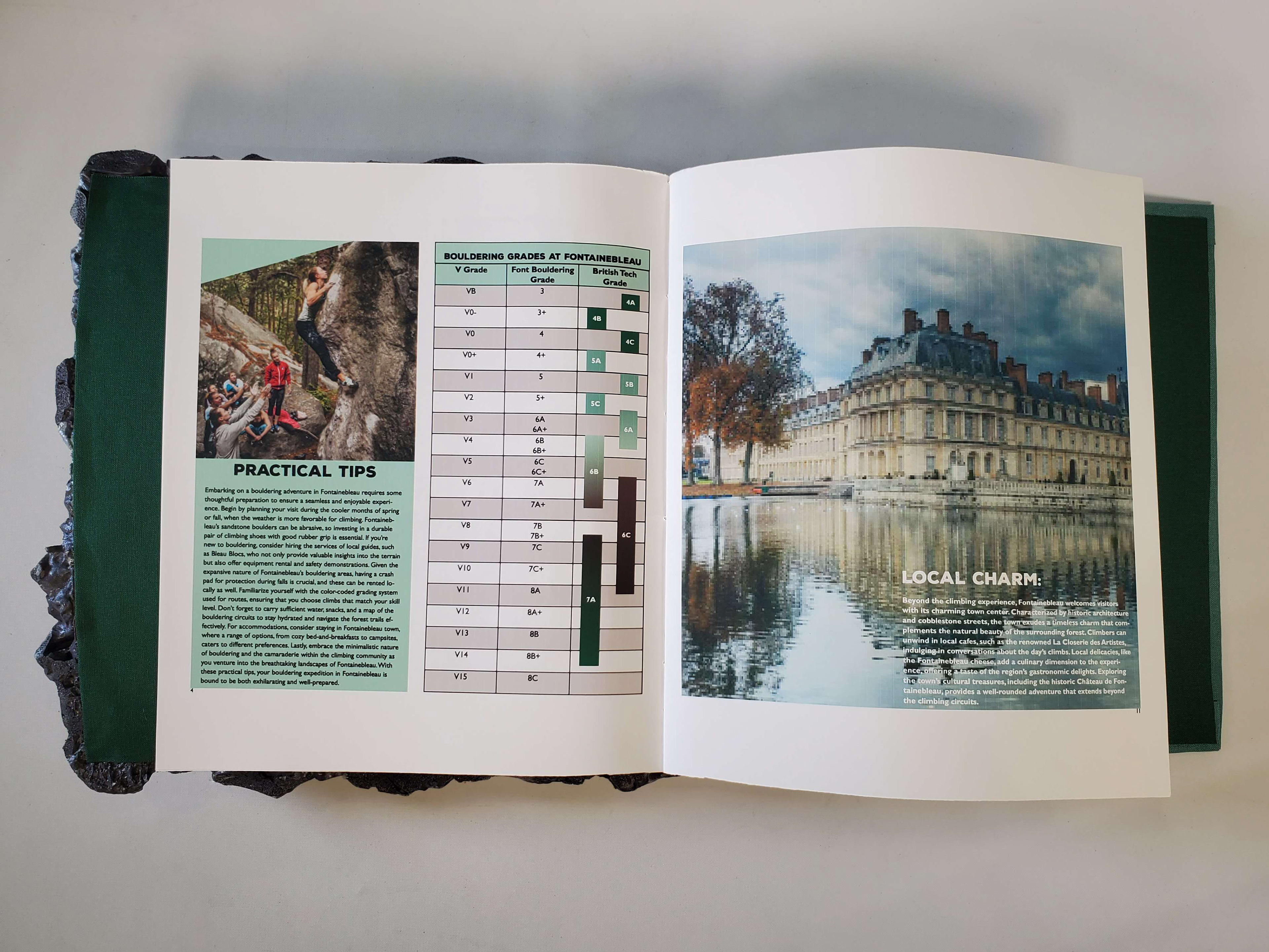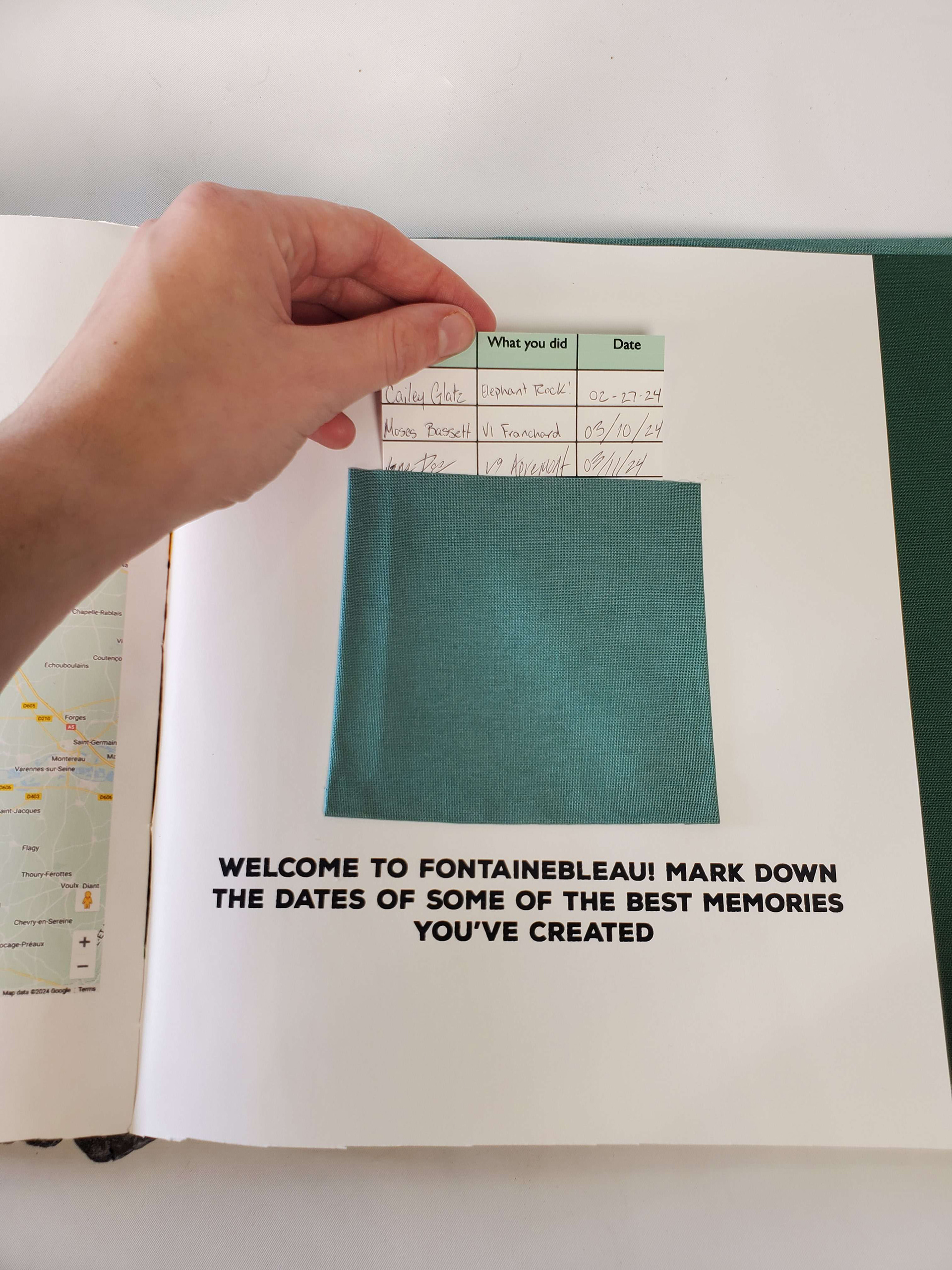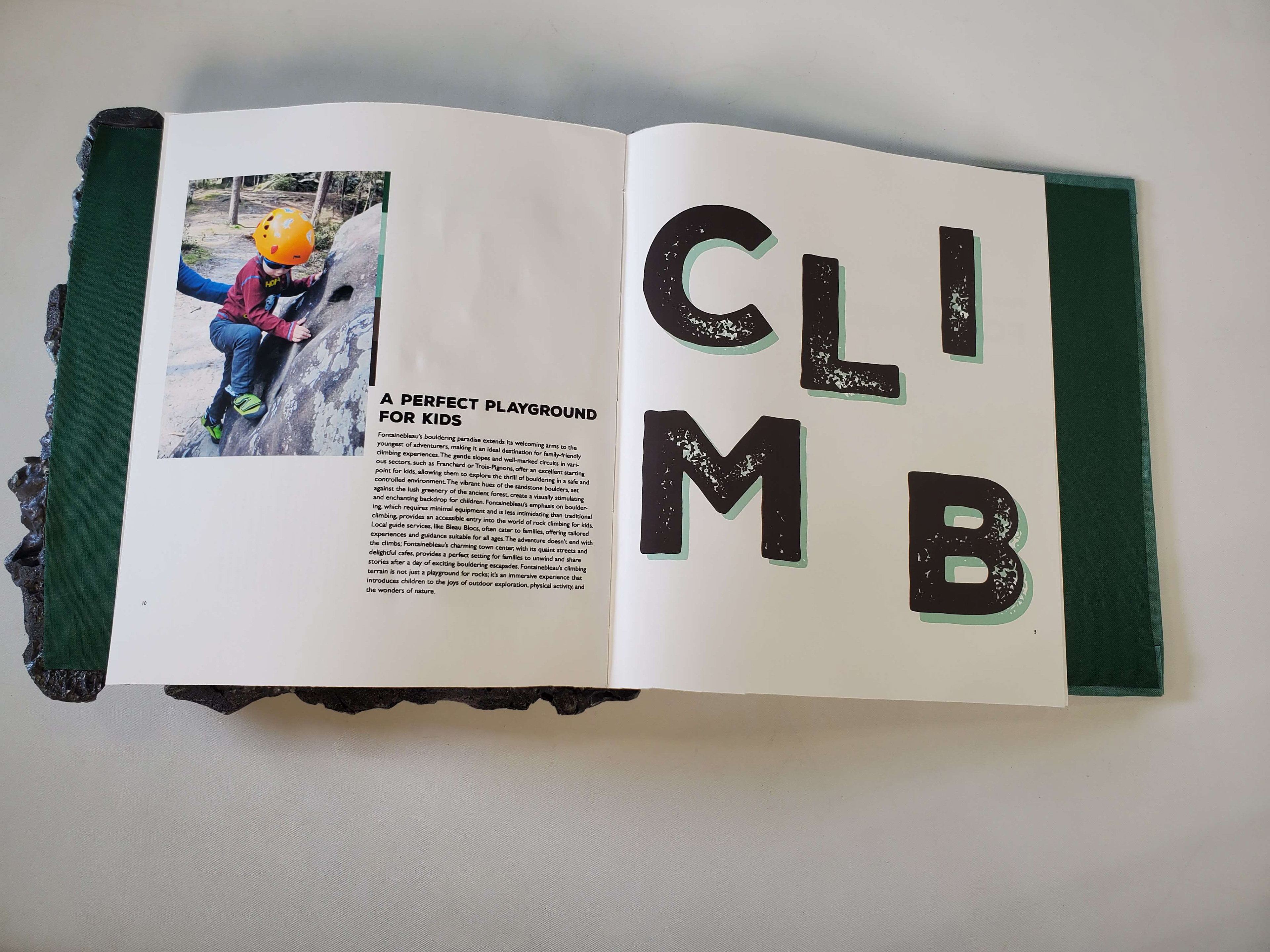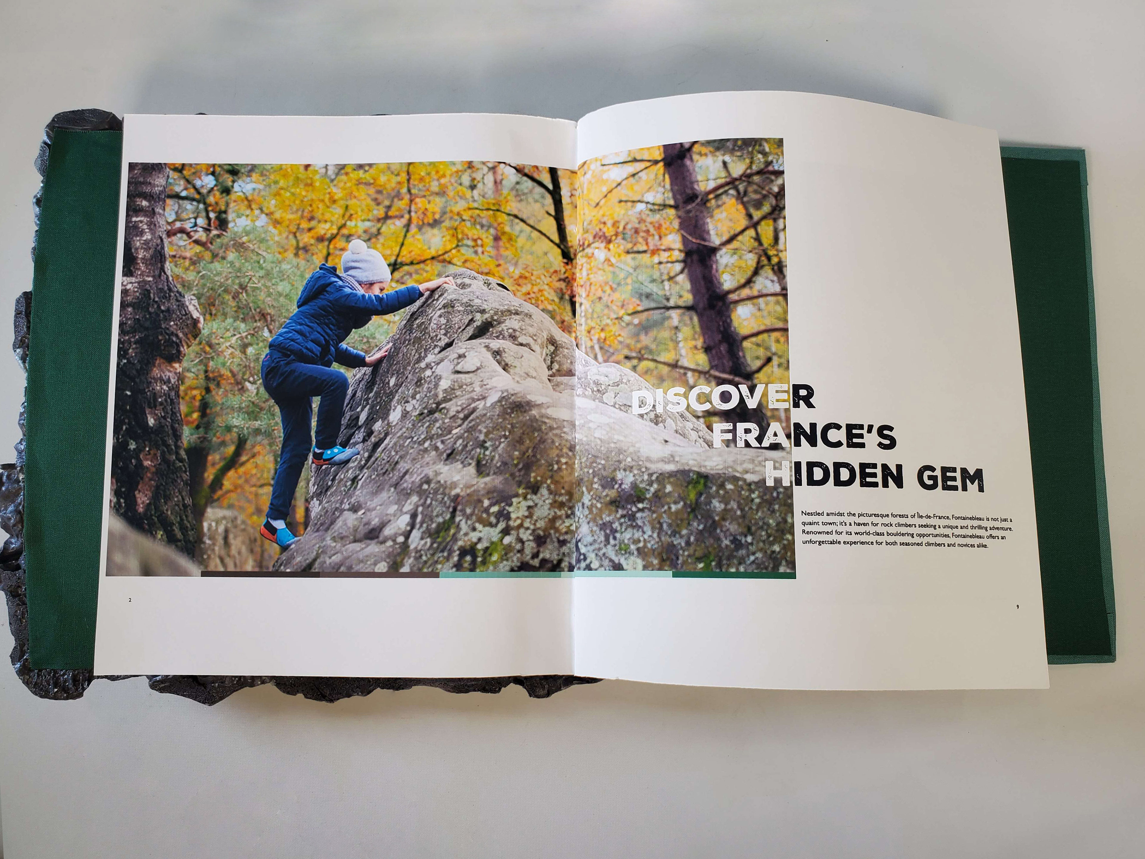 Scaling Heights in Fontainebleau is an informative book that uses interactive elements to engage its audience. Starting off with a realistic, rock-textured cover, it immediately appeals to rock climbing enthusiasts. Fontainebleau is home to one of the largest outdoor rock climbing areas in the world. Through interactive design elements, the book offers easy guidance for newcomers while also delivering in-depth insights for experienced climbers. Readers can flip through the pages to reveal a four-way pop-up showcasing the main sections, each containing detailed information. The end of the book offers a full-area map with markers for each rock face, as well as a customer written log documenting who has climbed there and when, allowing patrons to return and review past entries. This book was skillfully custom-made; cut, glued, and put together all by hand.